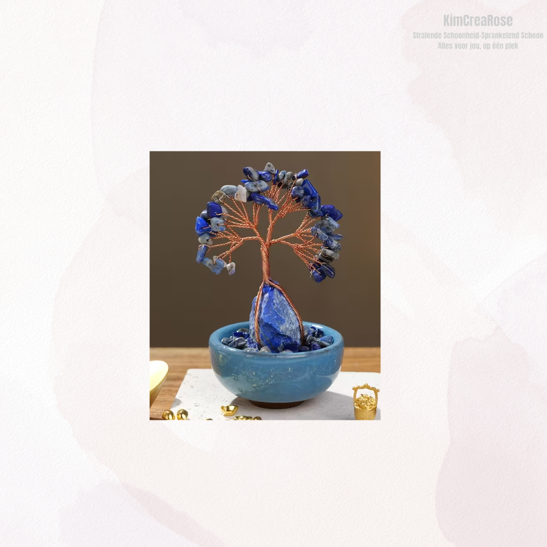 Elk boompje is uniek (zo'n 12cm hoog) — met zorg gevlochten koperdraad, echte edelstenen en een stevige basis in een bijpassend schaaltje. Een betoverende combinatie van natuur en vakmanschap.