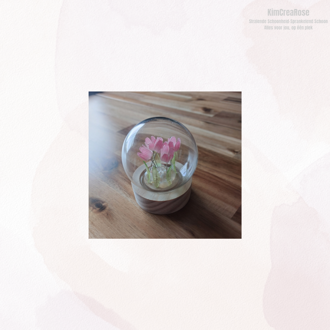 Laat je betoveren door de zachte gloed van dit prachtige tulpenlampje. In een elegante glazen bol rusten sierlijke tulpen die subtiel oplichten, waardoor een warme en rustgevende sfeer ontstaat. Dankzij het compacte formaat en de natuurlijke houten voet past dit lampje perfect op je nachtkastje, bureau of vensterbank.