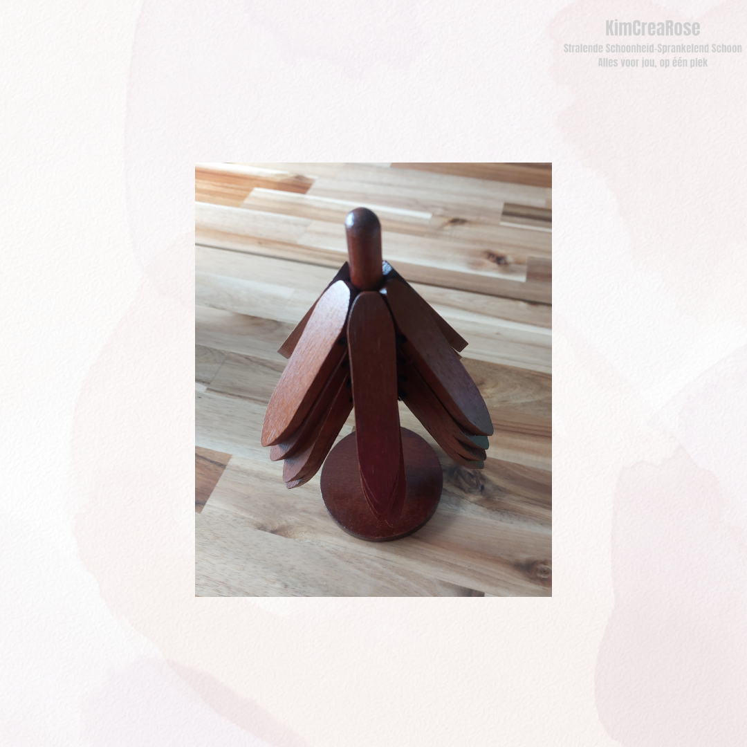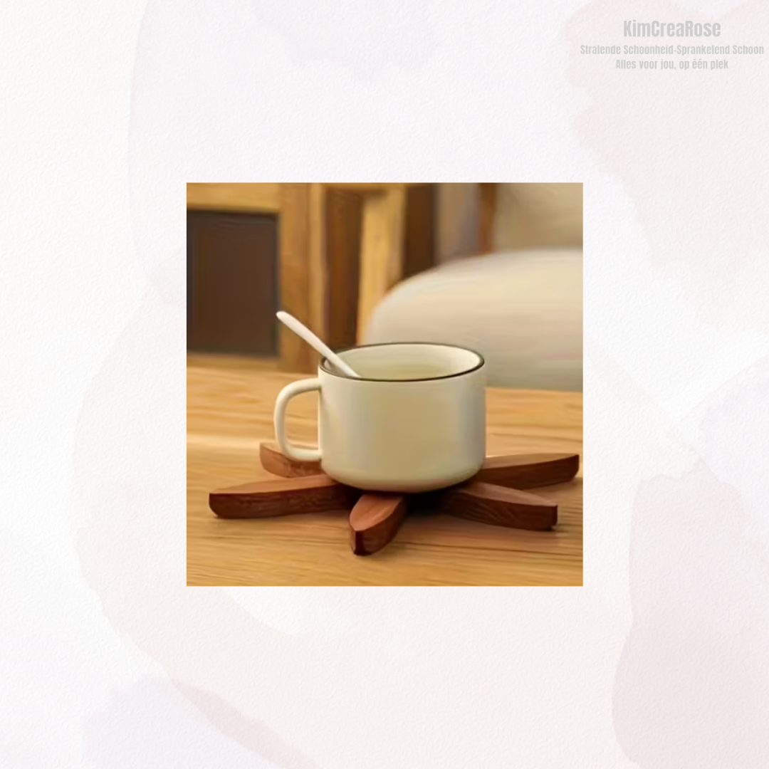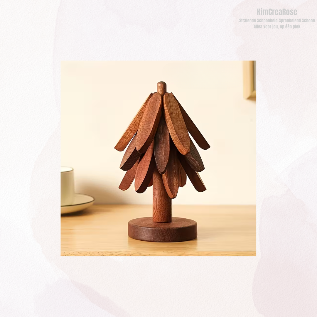 Met zorg vervaardigd uit hoogwaardig hout, straalt dit ontwerp eenvoud en rust uit. Wanneer de onderzetters niet in gebruik zijn, vormen ze samen een decoratieve boom – een stijlvolle toevoeging aan elk interieur.