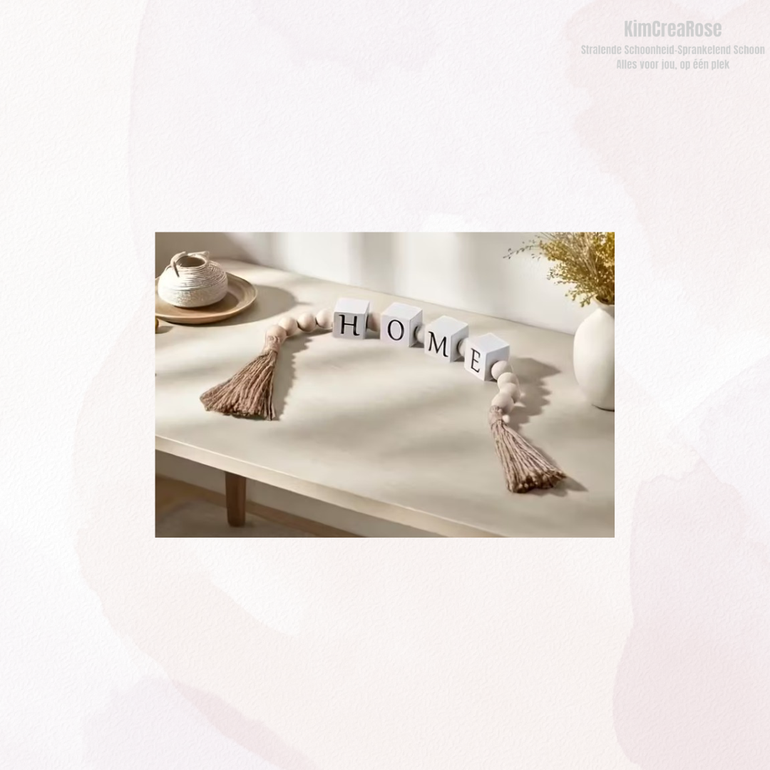 Breng rust, warmte en betekenis in je interieur met deze houten kralenkrans met kwasten. De natuurlijke houten kralen in combinatie met zachte kwasten en decoratieve letterblokjes maken dit een stijlvolle én persoonlijke woonaccessoire.