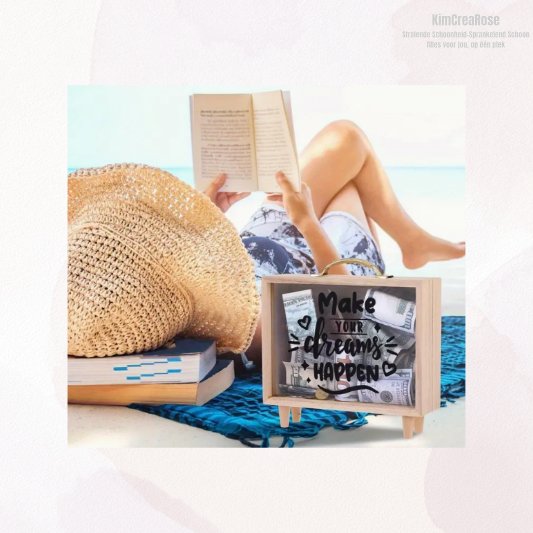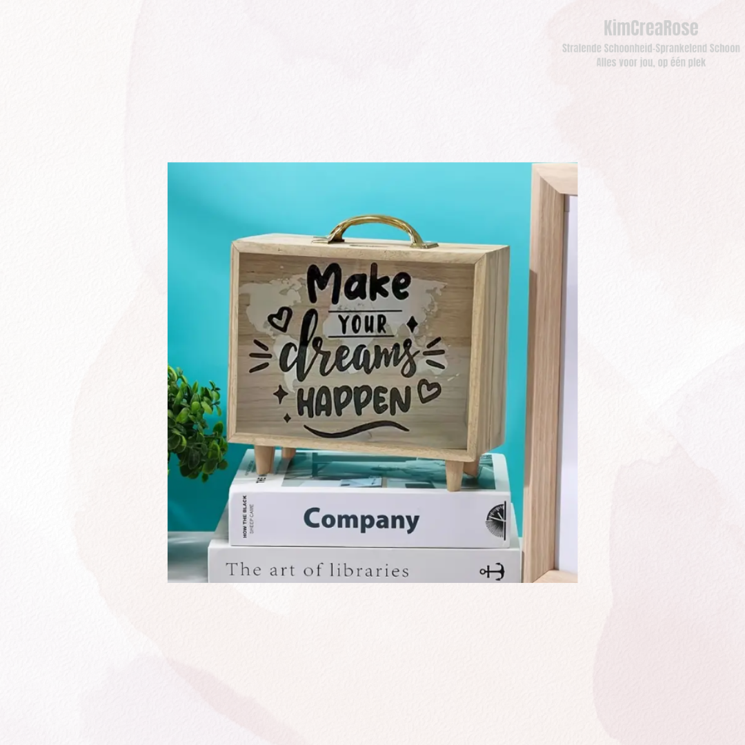 Deze stijlvolle houten reis spaarpot is perfect om te sparen voor dat ene avontuur dat je altijd al hebt willen beleven. Met de motiverende tekst "Make Your Dreams Happen" blijft jouw reisdroom altijd in zicht, terwijl je muntjes en briefjes verzamelt voor je volgende bestemming.