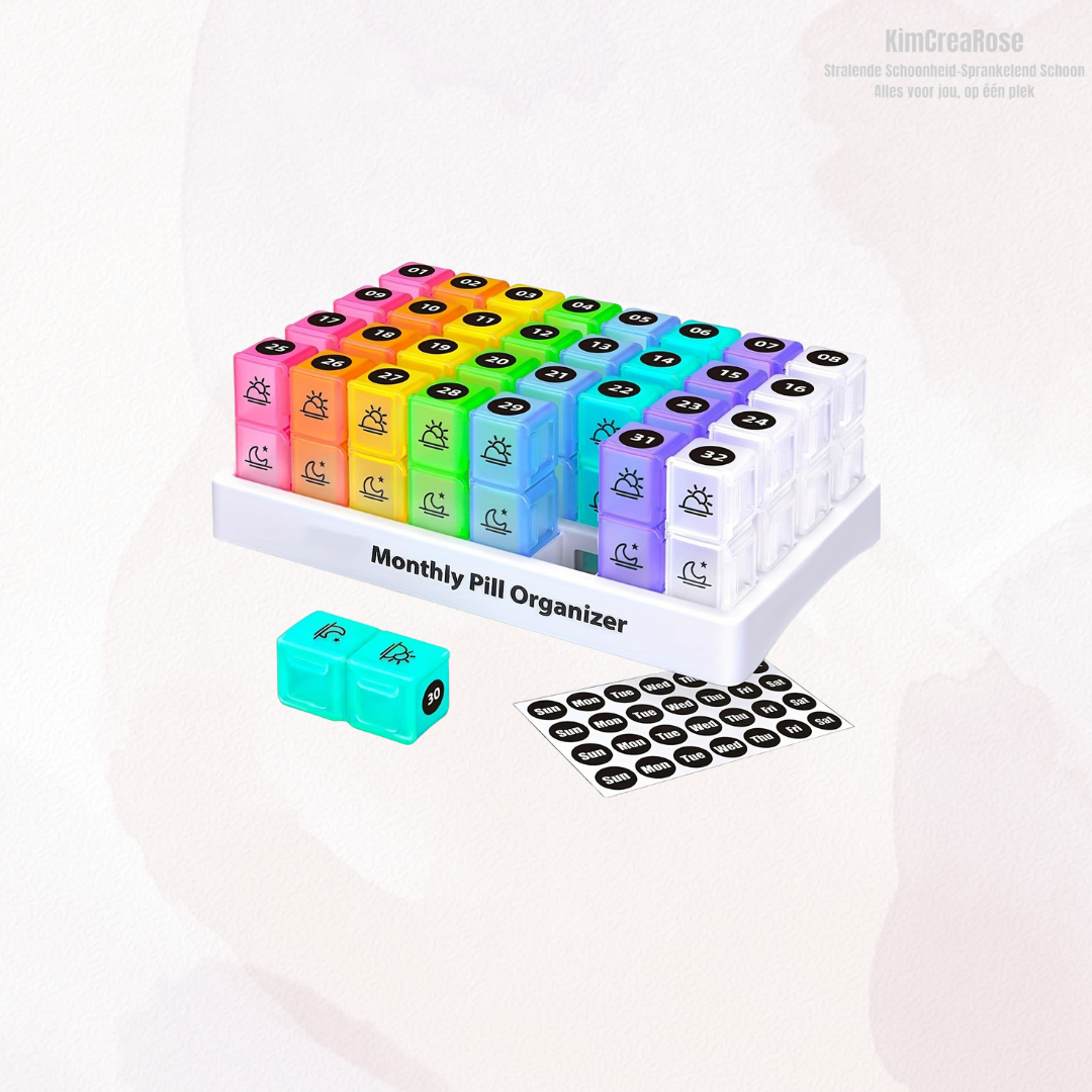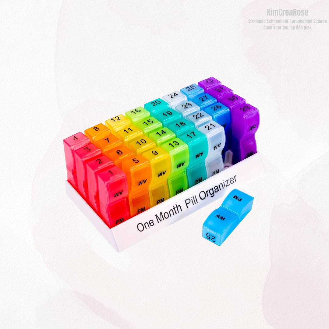Met deze maand pill organizer houd je eenvoudig overzicht over je medicatie of supplementen voor maar liefst 31 dagen. Elke dag heeft een eigen uitneembaar doosje met aparte vakjes voor ochtend (AM) en avond (PM). Zo weet je precies wat je wanneer moet innemen.