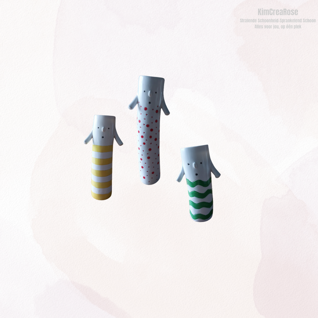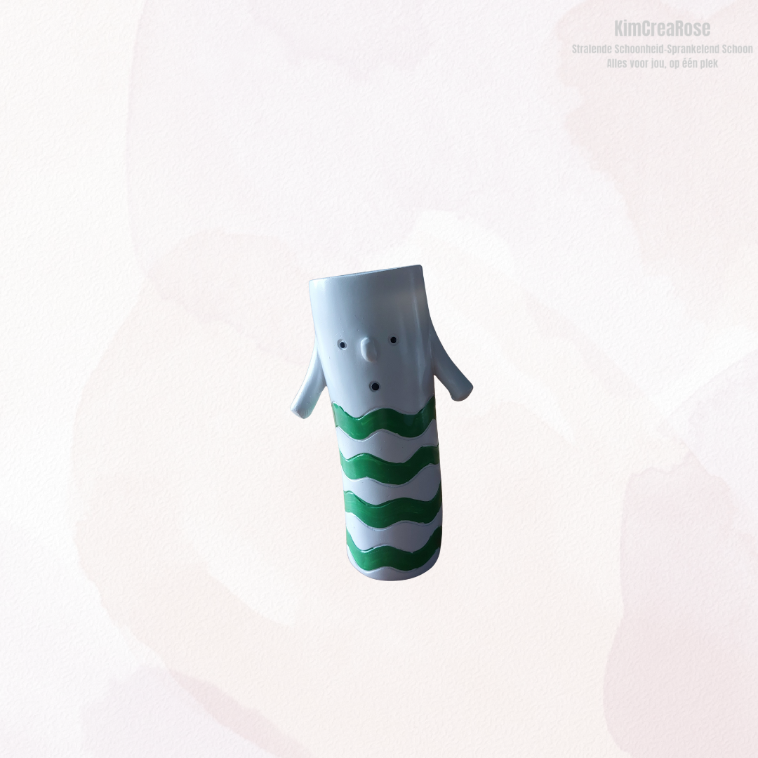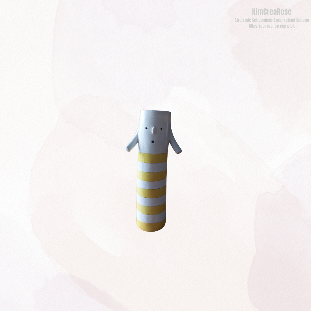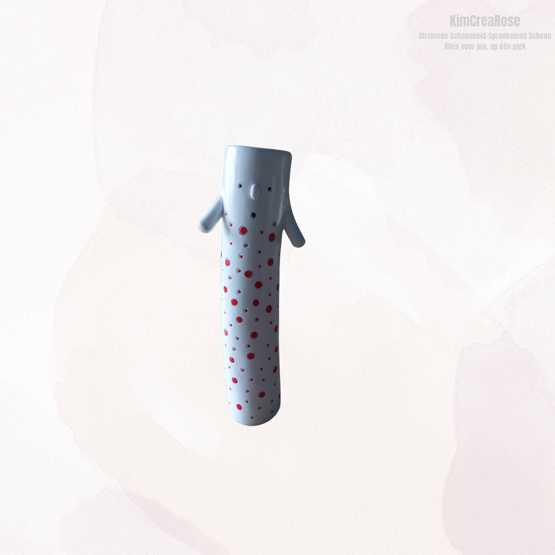Deze unieke designvaas is een echte blikvanger in elk interieur. Het slanke figuur met subtiel gezichtje en kleine armen geeft de vaas een speels en artistiek karakter. Verkrijgbaar in verschillende designs, elk met een eigen kleuraccent en patroon, waardoor elke vaas zijn eigen uitstraling heeft.